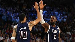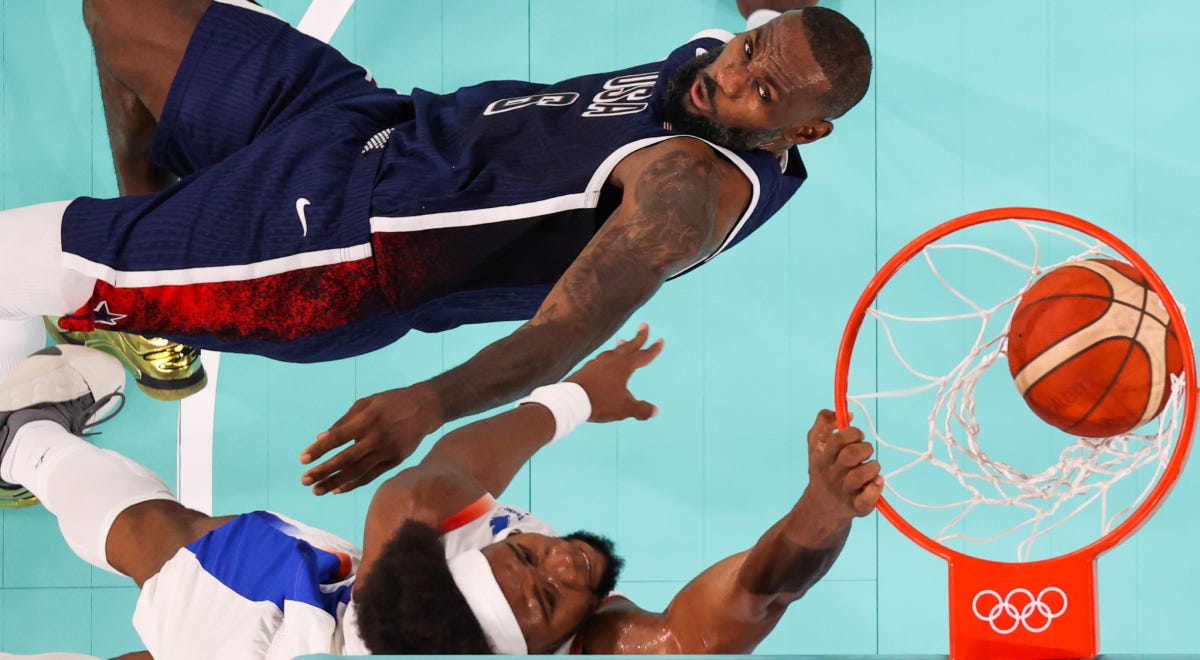 LeBron tries things like a pass behind his back or throwing the ball against the board, but with Wembanyama in the middle it was impossible. But neither LeBron and the american team lowered he level, in fact they increased it. LeBron scored a 2 pointer against Wembanyama (only for his physic) and Curry scores his first triple at the match.