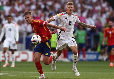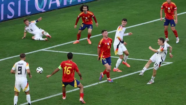 Germany, made a change, that was Jonathan Tah goes out and Thomas Müller enters, with that exchange Germany was like never before on the stadium, they were attacking like beasts and defending perfectly, so no ball could enter the goalkeeper area. And finally Wirtz recieved a pass from J.Kimmich, Spain is not defending well and… Gooooooooaaaaaaaaaaaal !!!!! From Germany on the minute 89’.